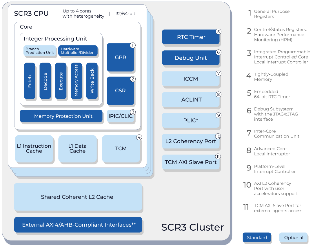 SCR3 支持 RISC-V 标准的 "I" 整数、"M" 整数乘法与除法、"A" 原子操作、"C" 16位压缩指令、"B" 位操作、"P" 打包SIMD(单指令多数据流)和 "K" 标量密码学扩展。SCR3 配备了顺序执行的 5 级流水线、一个用于高效代码执行的分支预测单元、用于高效中断处理的 PLIC 或 IPIC 单元,以及行业标准的 AHB、AXI4、JTAG 和 cJTAG 接口,以实现灵活性和兼容性。