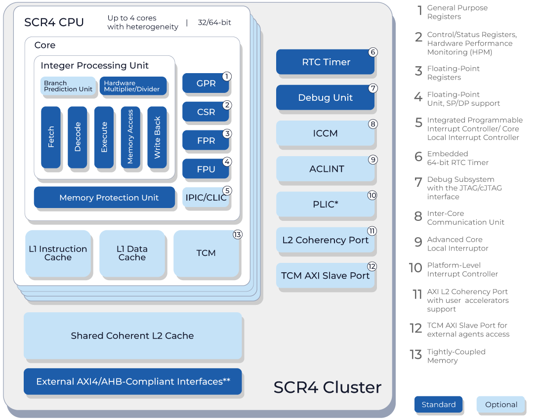 SCR4 核心完全支持 RISC-V 标准的 "I" 整数、"M" 整数乘法与除法、"A" 原子操作、"C" 16位压缩指令、"F" 单精度浮点、"D" 双精度浮点、"B" 位操作、"P" 打包SIMD(单指令多数据流)和 "K" 标量密码学扩展。SCR4 包含一个顺序执行的 5 级流水线、一个浮点单元、一个用于高效代码执行的分支预测单元、独立的 L1 指令和数据缓存、用于高效中断处理的 PLIC 或 IPIC 单元,以及行业标准的 AHB、AXI4、JTAG 和 cJTAG 接口,提高了灵活性和兼容性。