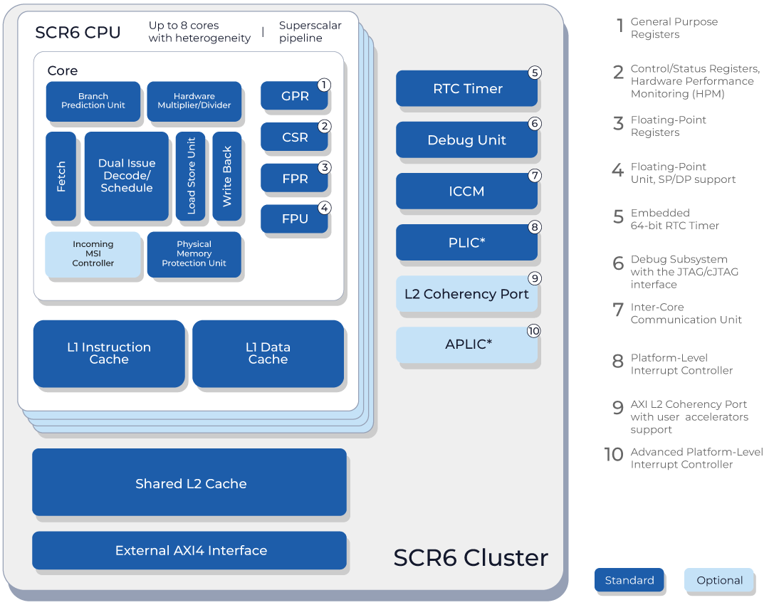 SCR6 核心支持 RISC-V 标准的 "I" 整数、"M" 整数乘法与除法、"A" 原子操作、"C" 16位压缩指令,以及单精度 ("F") 和双精度 ("D") 浮点扩展。SCR6 包含一个乱序执行的超标量 12 级流水线、一个高精度浮点单元、一个分支预测单元、用于高效中断处理的 PLIC 或 APLIC 单元,以及提供灵活性和兼容性的行业标准 AXI4 和 JTAG/cJTAG 接口。