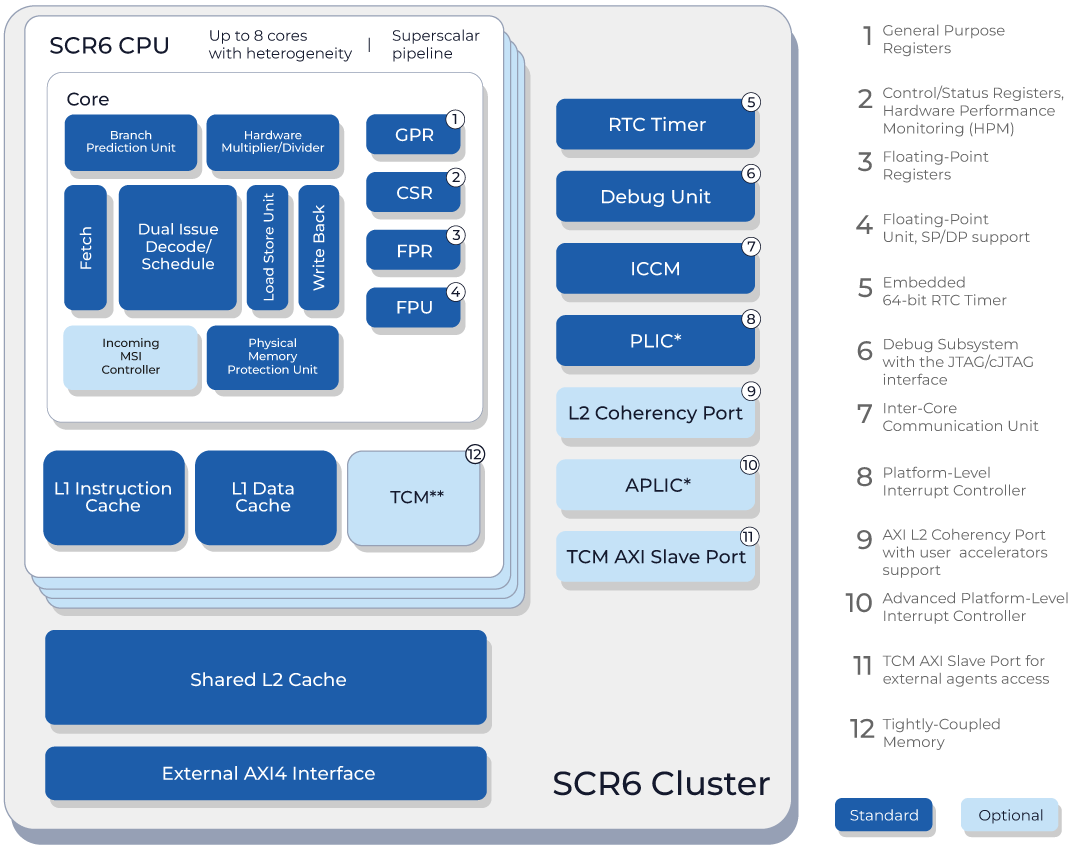 SCR6 核心支持 RISC-V 标准的“I”整数、“M”整数乘法和除法、“A”原子、“C”16位压缩,以及单精度和双精度浮点数——“F”和“D”扩展。SCR6 包括失序超标量 12 级流水线、一个高精度浮点单元、一个分支预测单元、用于高效中断处理的 PLIC 或 APLIC 单元,以及符合行业标准的 AXI4 和 JTAG 接口,从而实现灵活性和兼容性。