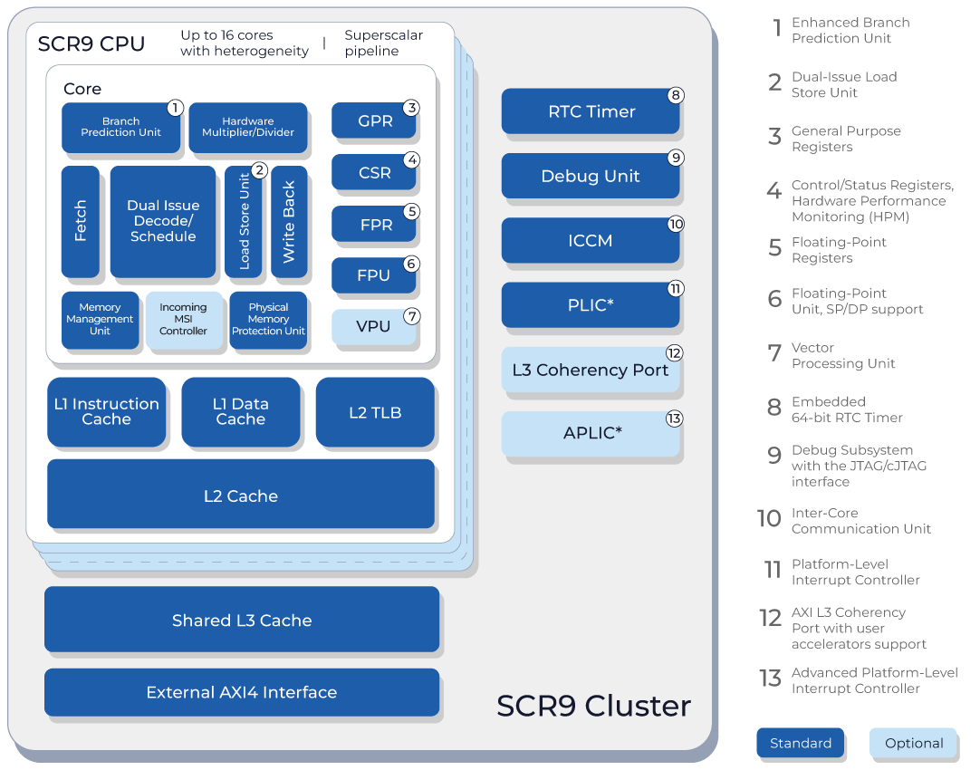 SCR9 平台包括一个无序超标量双发射 12 级流水线、一个高性能双通道浮点运算单元、用于高级中断处理的 PLIC 或 APLIC 单元以及符合行业标准的 AXI4 和 JTAG 接口,从而提高了灵活性和兼容性。SCR9 包括增强型数据预取器、优化的 L1 和 L2 高速缓存以及最大容量为 16MB 的 L3 片上网络高速缓存。硬件管理程序、矢量运算和异构支持使得多集群架构设计能够运行 AOSP 和 Linux 操作系统。SCR9 核心能在异构多核(一个集群中最多 16 个核心)环境下运行,为内存一致性和简化外部加速器的集成提供硬件级支持。
